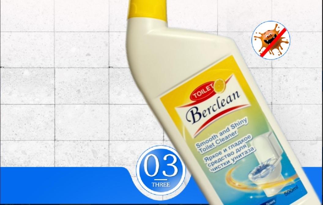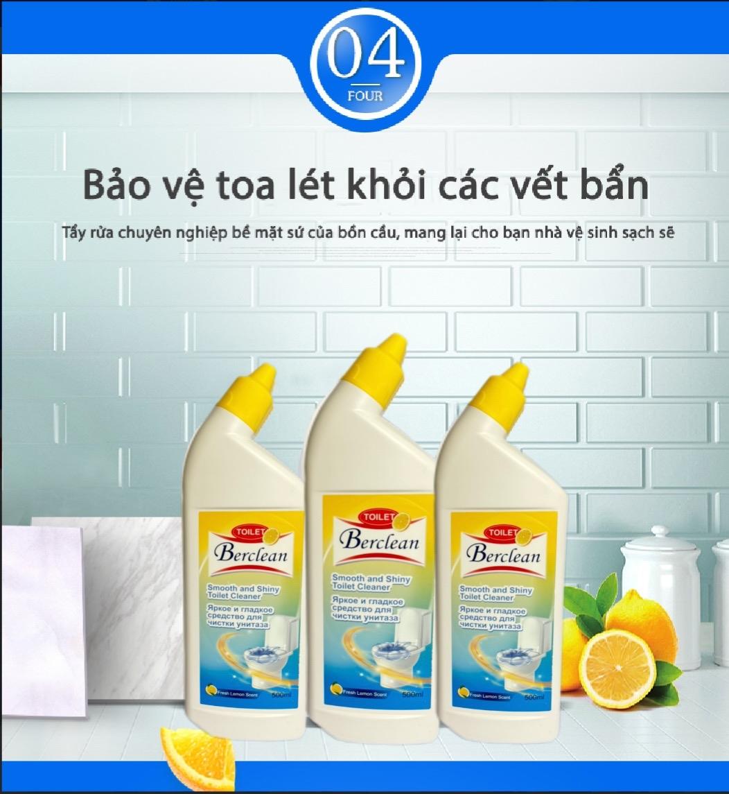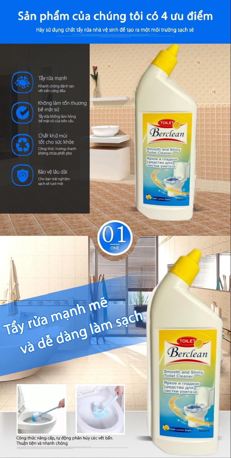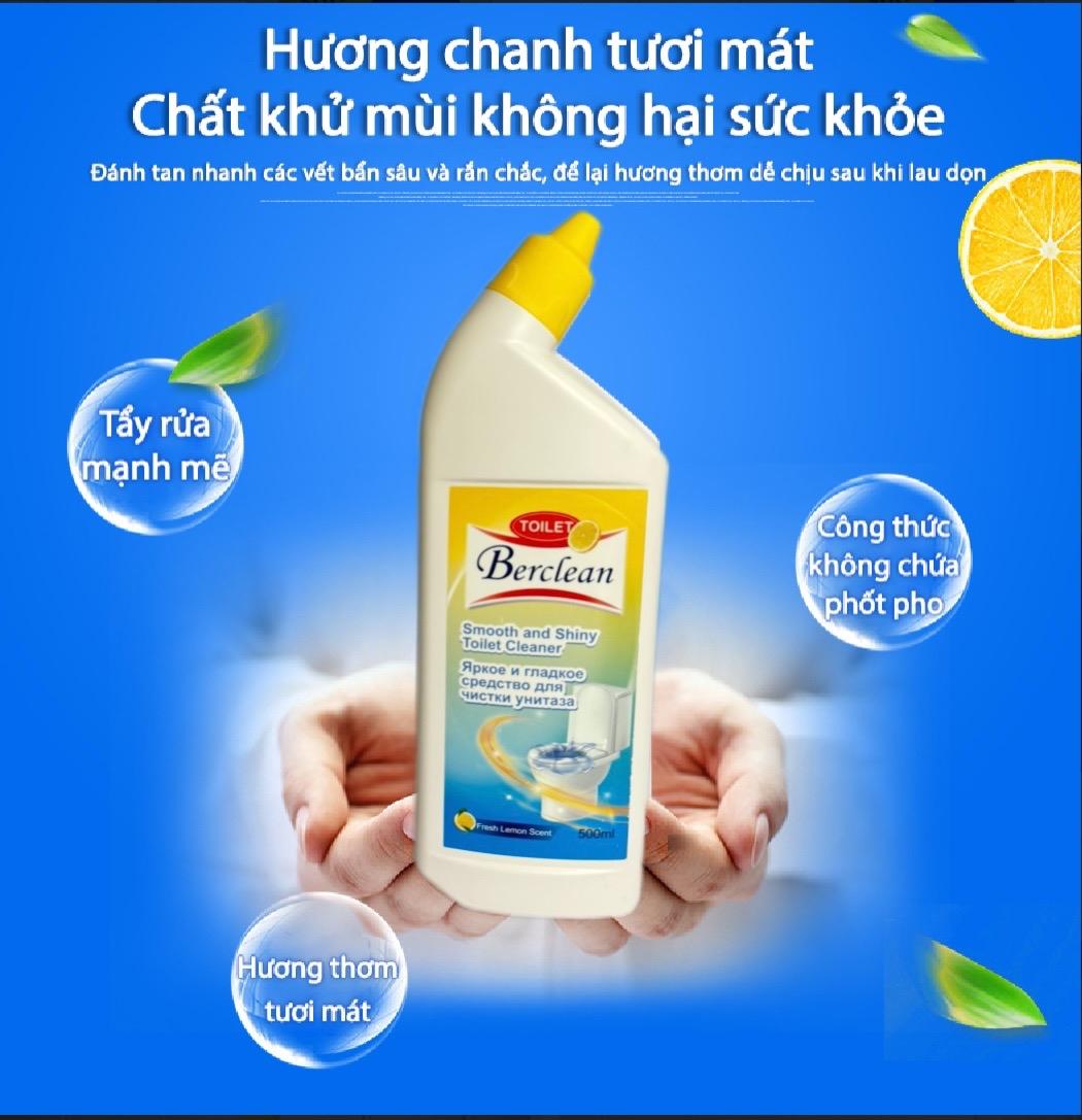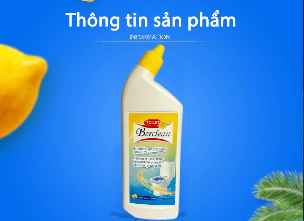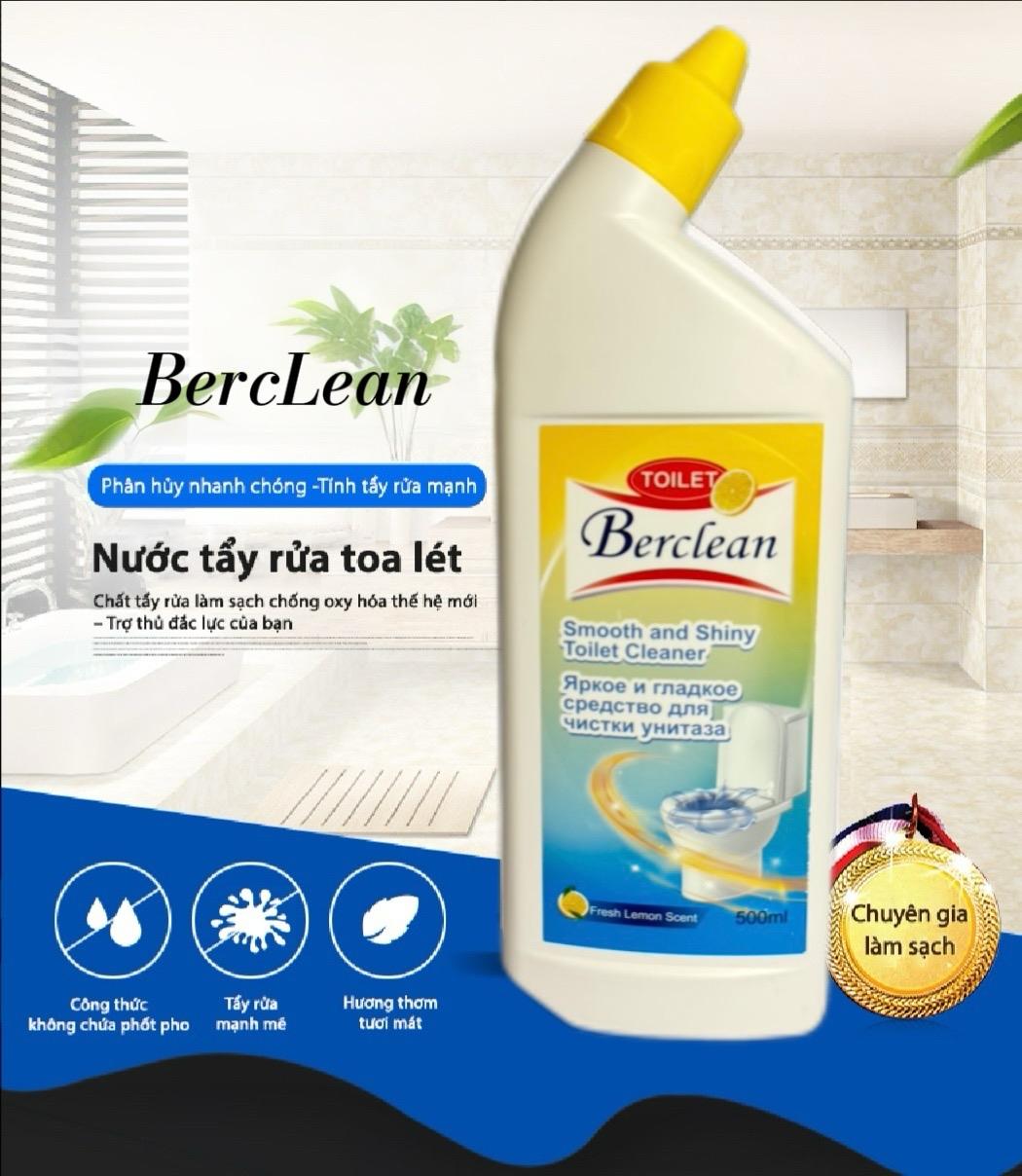 - Nước Tẩy Rửa Toilet Công Nghệ Sinh Học Berclean 500ml là giải pháp làm sạch hiện đại dành cho mọi gia đình. Ứng dụng công nghệ sinh học tiên tiến, sản phẩm giúp tẩy sạch vết bẩn, khử mùi hôi hiệu quả mà không gây hại da tay hay làm hỏng bề mặt sứ.